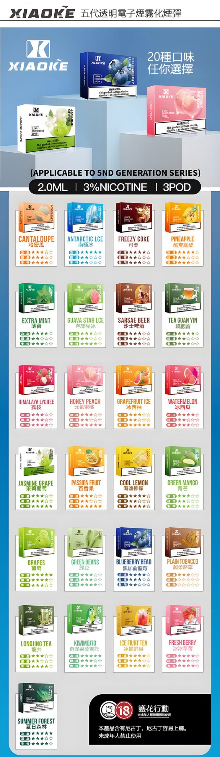 XIAOKE 梟客五代煙彈採用高精度霧化結構與優質發熱芯,帶來真實且細膩的口感還原。內含精選煙油配方,入口順滑、層次豐富,並且與多款主流五代主機高度兼容,滿足不同玩家的口味需求。